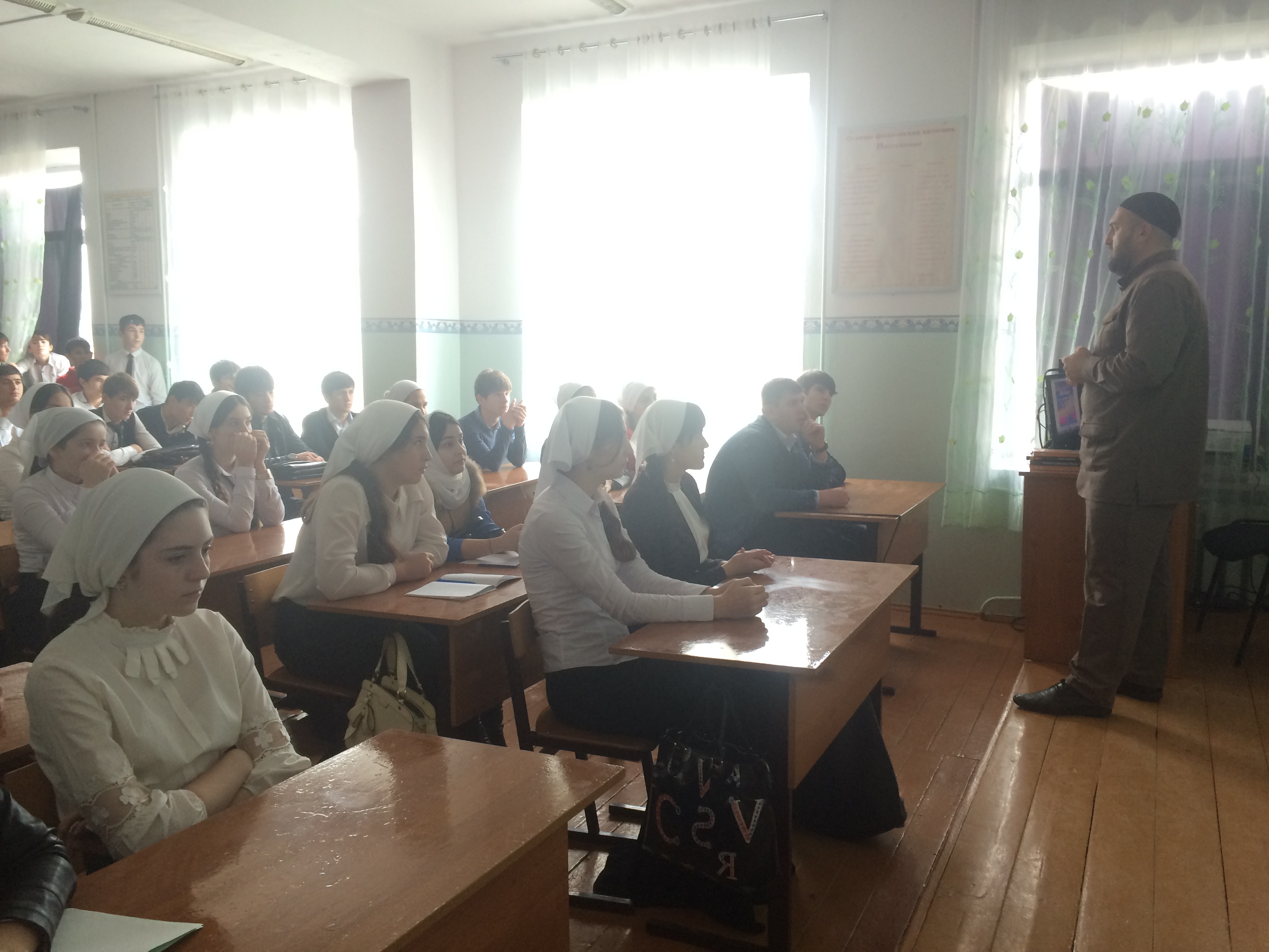 В рамках проведения предметной недели в школе проходят открытые тематические классные часы, мероприятия, приуроченные Дню рождения Пророка Мухаммада (с.1.в.). Педагог- организатор по ДНВ и Р Хайдаев И.М. провел беседу на тему: «Благие дела Пророка Мухаммада (с.а.в.)». Классный руководитель 11 класса Закаева М.Х. провела открытый классный час на тему: «Мухаммад (с.а.в.) – печать Пророков». Учащиеся 9-х классов написали сочинение на тему: «Жизнь и деятельность Пророка Мухаммада (с.а.в.)». 18.12.2015г. состоятся открытые классные часы в 8-х кл.на тему:«Качества Пророка Мухаммад (с.а.в.)».Завершится предметная неделя проведением 19.12.2015г. конкурса «Лучший знаток семейного паспорта Пророка Мухаммад (с.а.в.)» среди учащихся 7- 11 классов (Ответственный: организатор по ДНВ и Р Хайдаев И.М.)