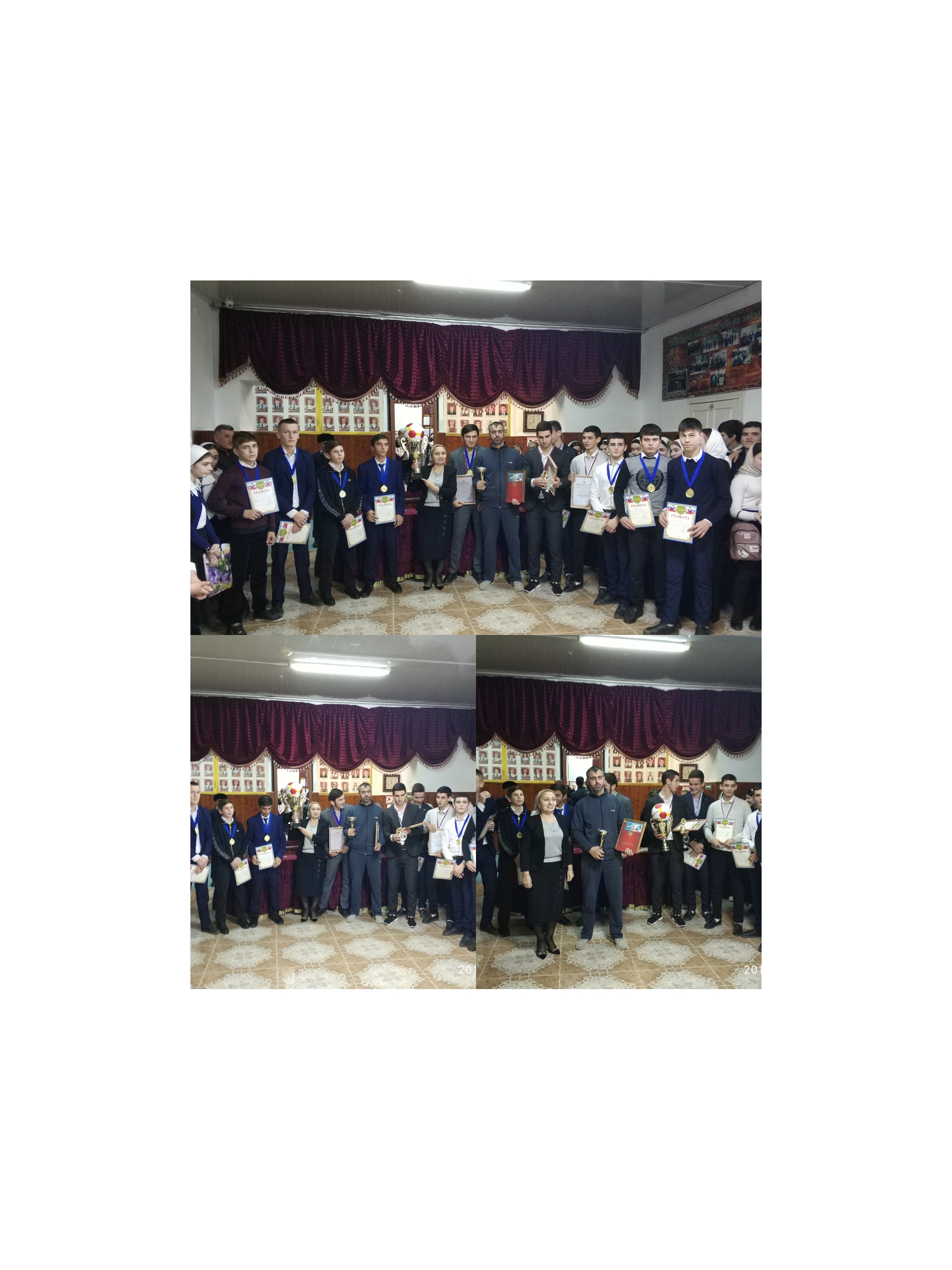 Сегодня в фойе школы состоялось торжественное чествование победителей спартакиады "Волшебный мяч". Директор школы Магомадова Зарета Хусаиновна поздравила ребят с уверенной победой в городских соревнованиях, пожелала, чтобы и в дальнейшем наши ученики достигали поставленных целей, новых высот.