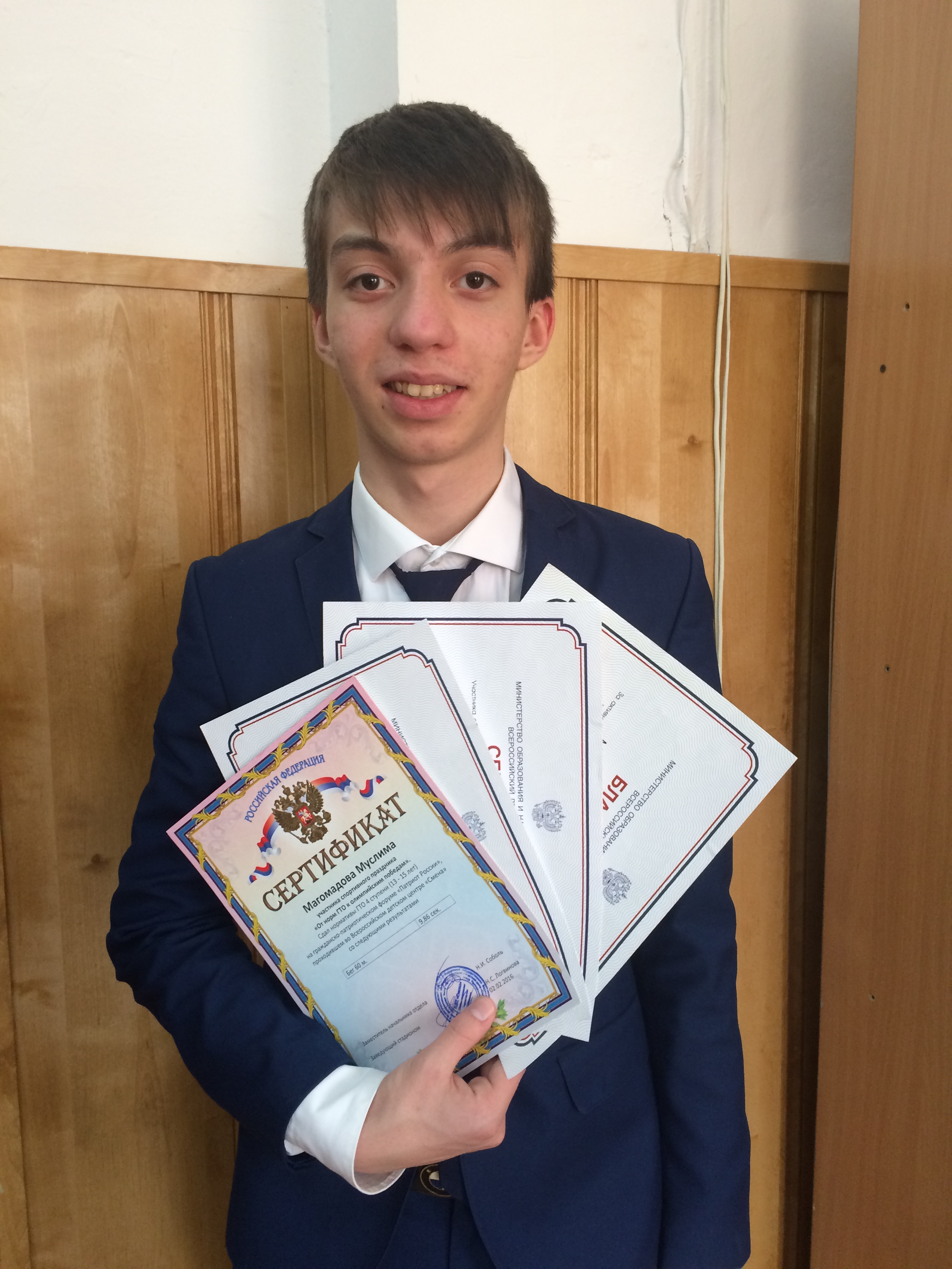 Форум объединил молодежь из 36 регионов нашей страны, для которых патриотизм - это любовь к своей родине, которые ценят и знают прошлое своей страны, активно участвуют в ее настоящем и планируют ее будущее; для которых патриотизм – это знание и уважение родной культуры, родных традиций, родного языка, это любовь и уважение к своим соотечественникам. В рамках проведения форума «Патриоты России» были проведены мероприятия культурно-эстетического и спортивного направления. Наш Муслим завоевал сертификаты участника спортивного праздника «От норм ГТО к олимпийским победам», участника образовательной программы «Веб-дизайн и создание сайтов «От идеи до реализации», за активное участие в физкультурно-оздоровительной деятельности, за помощь в организации спортивных мероприятий и пропаганду здорового образа жизни на Гражданско-патриотическом форуме «Патриот России». Также объявлена благодарность за активное участие в мероприятиях культурно-эстетического направления «Русская идея» Гражданско-патриотического форума «Патриот России» в период с 29 по 11 февраля 2016 года во Всероссийском детском центре «Смена». Поздравляем! Желаем дальнейших побед!
