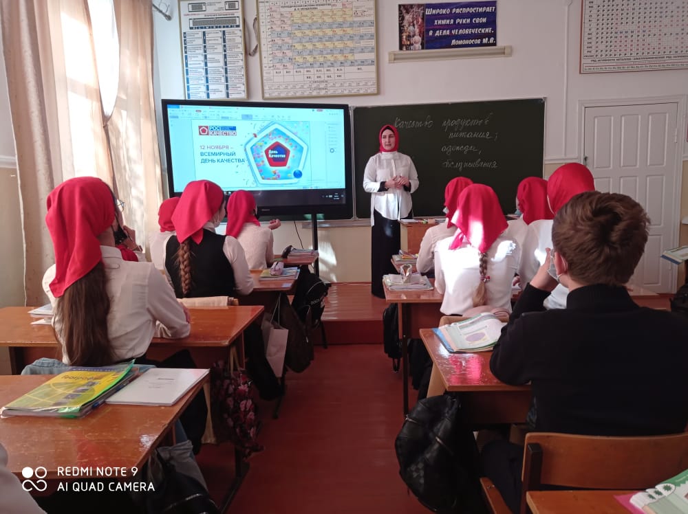 Урок качества в 7 а классе (учитель Зубайраева Х.С.); Презентация «Роскачество» в 10 классе (учитель Ахматова Л.Г.); Игра-упражнение «Kata в классе-1» в 3 а классе (учитель Шаипова А.К.).