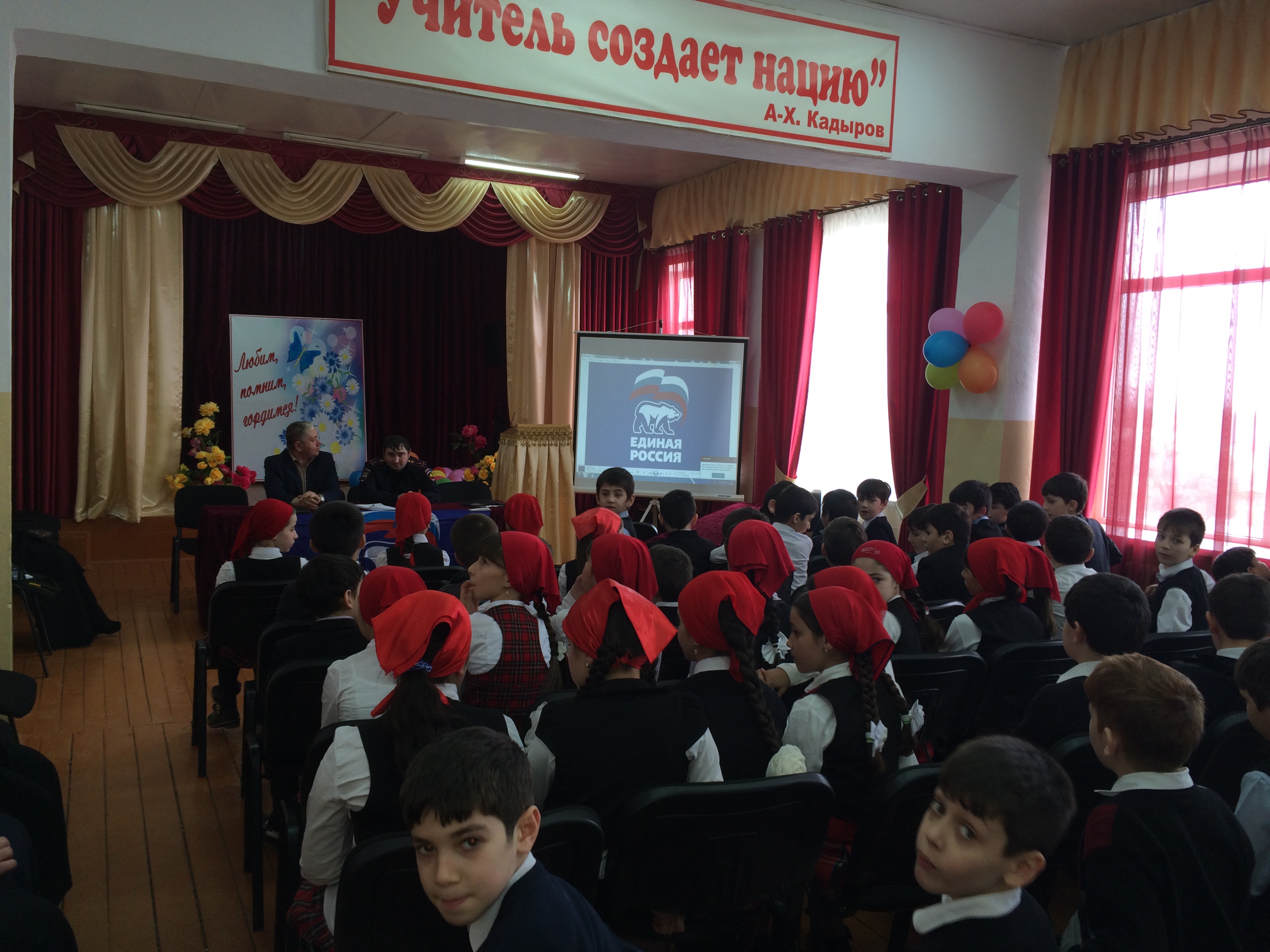 На мероприятии присутствовали гости: Вахаев Абдулмажед Хамзатович – руководитель Гудермесского отделения партии «Единая Россия», старший лейтенант полиции Масаев Зелимхан Шамханович – инспектор по пропаганде БДД ОГИБДД ОМВД России по Гудермесскому району, Касумова Хава Ибрагимовна – помощник руководителя партии «Единая Россия» и представитель СМИ газеты «Гумс». Состоялся живой диалог между гостями и учащимися. Инспектор Масаев Зелимхан Ш. ответил на вопросы детей и похвалил их за знания ПДД.