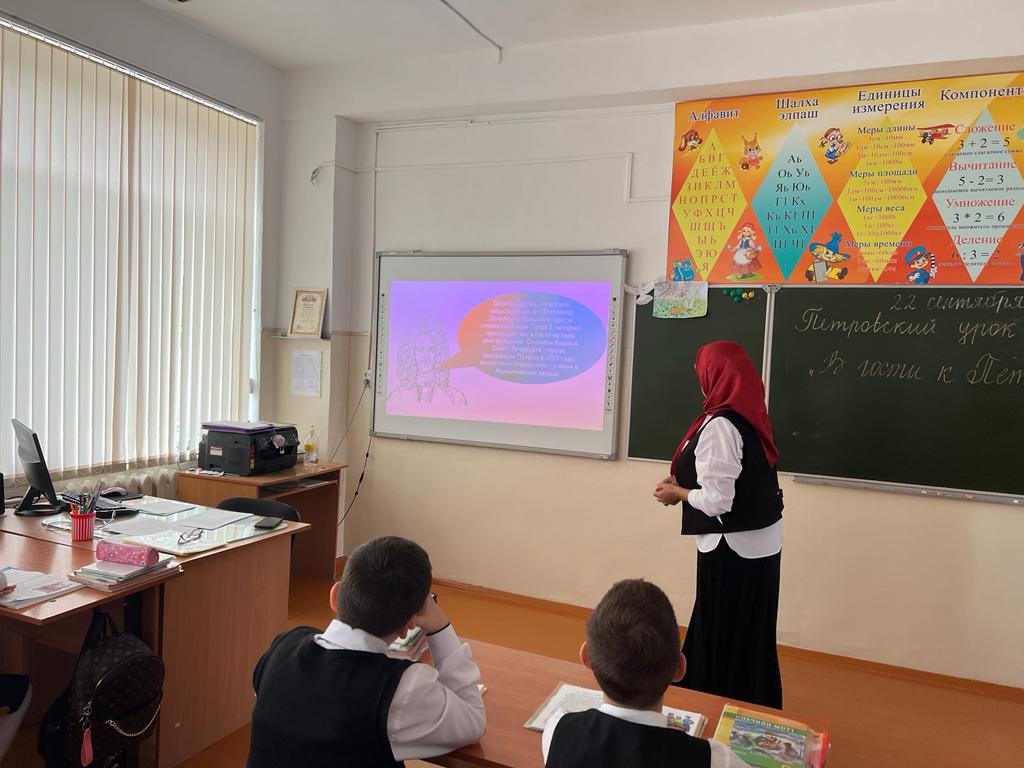 В рамках Плана основных мероприятий по подготовке и проведению празднования 350-летия со дня рождения Петра I,с целью повышения познавательного интереса обучающихся к жизни и деятельности Петра I, его вкладу в развитие российской государственности и укрепление Российской Империи в МБОУ «Гудермесская СШ N7”,22 сентября 2022 года в 1-11 классах, прошли Петровские уроки. Учащиеся с интересом слушали истории из жизни «дедушки русского флота», узнали много нового.