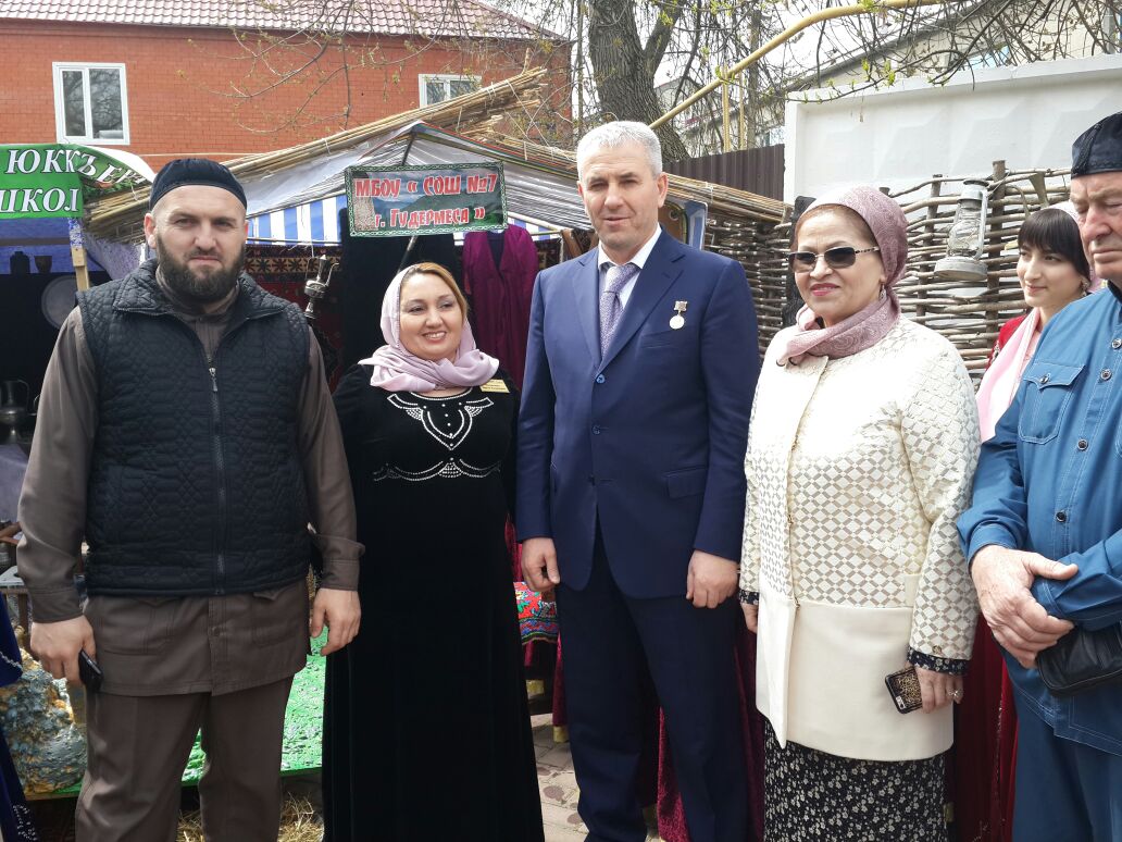 В мероприятии приняли участие все школы Гудермесского района. МБОУ «СОШ №7 г.Гудермеса» представила оригинальную композицию чеченского быта и изобилие вкусных национальных блюд. Молодые джигиты и девушки горянки в национальных костюмах встречали гостей, представляя культуру чеченского народа. А ученики 8 класса Магомадов Муслим,Сурхаев Джабраил, Мулуев Мансур приветствовали всех в национальных костюмах. Исторические кувшины, ковры, истанг, верта, нохчийн пеш, дечиг-маьнга, урчакх, прялка и многое другое изумляли и радовали всех гостей. Гостеприимно принимал своих гостей коллектив МБОУ «СОШ №7 г.Гудермеса», угощая всех вкусными национальными блюдами. Большая поделка «У подножья гор», сделанная руками учащихся школы, вызывала восхищение посетителей. Также в фойе Дома творчества организована выставка книг чеченских авторов. Не остались равнодушными к колоритному и уютному «дому» и самые дорогие гости: министр образования и науки ЧР Байханов И.Б. и начальник Управления образования Куразова М.И.,оставив на память фотографию. В центральном сквере организован «синкъерам», которое было приурочено ко Дню чеченского языка, и включало театрализованные сценки, демонстрирующие порядок проведения «синкъерам» в соответствии с чеченскими обычаями и традициями. Старинный чеченский обряд “синкъерам” является стержневым фактором в традиционной чеченской духовной культуре.Праздник прошел весело в сопровождении чеченских