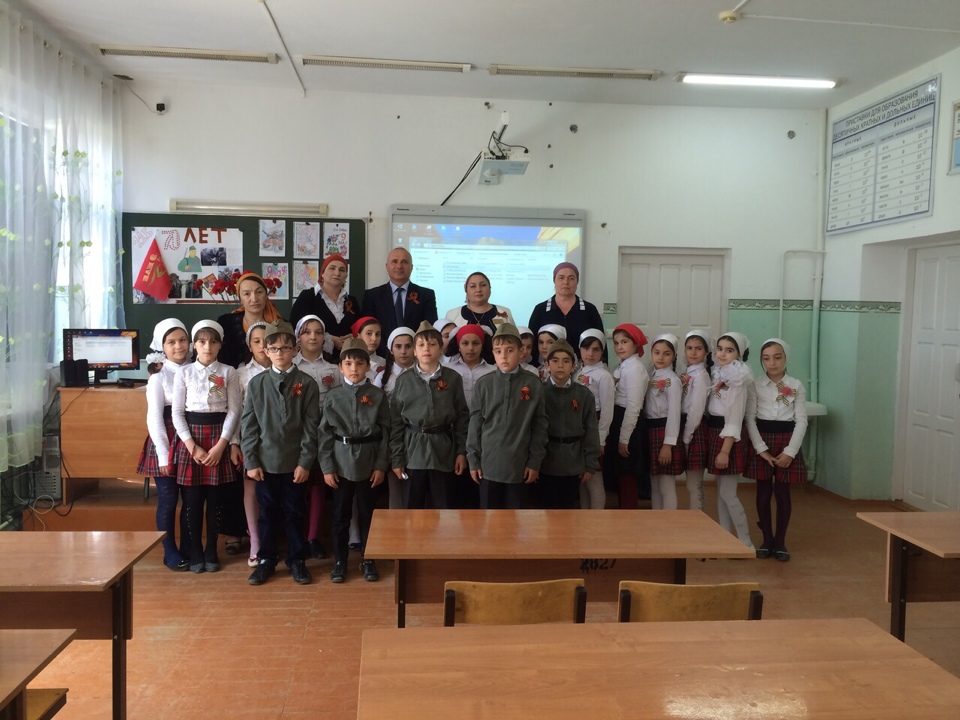 Пусть весной опять цветут сады,В радости живёт страна родная,Сбудутся все планы и мечты! Счастья и добра! С Девятым Мая! День Победы - святой праздник для всех россиян. В память павших героев Великой Отечественной войны директор школы Магомадова З.Х. вместе с учителями и учащимися возложили цветы к мемориалу на территории школы. В эти предпраздничные дни в нашей школе проведено немало мероприятий, посвященных 70-летию Победы. Это и конкурс тематических стенгазет «Салют, Победа», и оформление стенда «Герои Чечни», и выставка поделок учащихся «Поклонимся тем великим годам», и праздничный концерт, посвященный юбилею Победы, и военно-патриотическая игра «Зарница», и тематические классные часы, посвященные 70-летию Победы в Великой Отечественной войне в 1-11 классах, и встреча с ветеранами.
